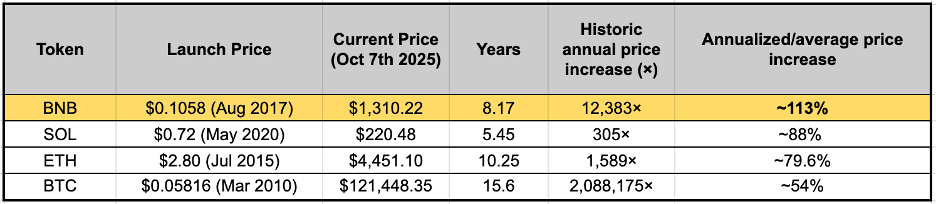 Unlike peers whose performance is often tightly correlated with broader market beta, BNB shows structural decoupling behavior. Even across bear markets (2018, 2022), BNB retained relative strength and rapidly reclaimed new highs—demonstrating resilience, float compression effects, and demand stickiness that treasury-focused allocators should value.