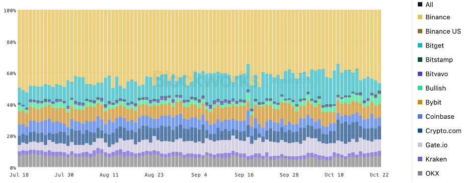 Title: Exchange Spot Volume Market Share Source: Blockworks Research, as of Oct 22nd, 2025